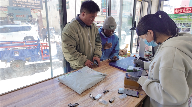 定日縣中通快遞公司營業(yè)網(wǎng)點也十分繁忙,幾位工作人員埋頭分揀,來這里發(fā)快遞的群眾在窗口外排隊辦業(yè)務(wù)。網(wǎng)點負(fù)責(zé)人秦女士介紹,中通快遞的網(wǎng)點已經(jīng)布設(shè)到定日縣的曲洛鄉(xiāng)、措果鄉(xiāng)、扎果鄉(xiāng)、扎西宗鄉(xiāng)等,而位于縣城的營業(yè)網(wǎng)點還代收圓通、申通、韻達、極兔等快遞公司的快遞,最近收件量特別大,網(wǎng)點11個員工每天從早上9點忙到晚上10點半,才能完成當(dāng)天的分揀、信息錄入和與郵政對接等工作。