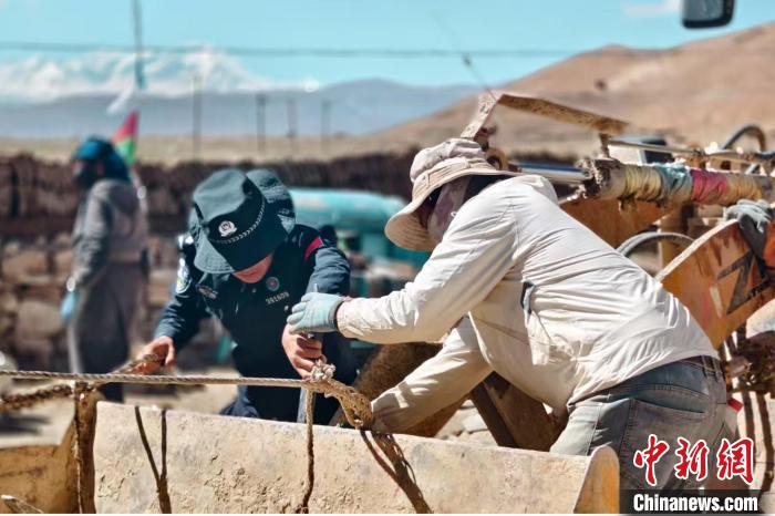 圖為西藏出入境邊防檢查總站第十四批駐村工作隊(duì)隊(duì)員與當(dāng)?shù)卮迕窆餐_(kāi)展災(zāi)后重建。徐廣立 攝