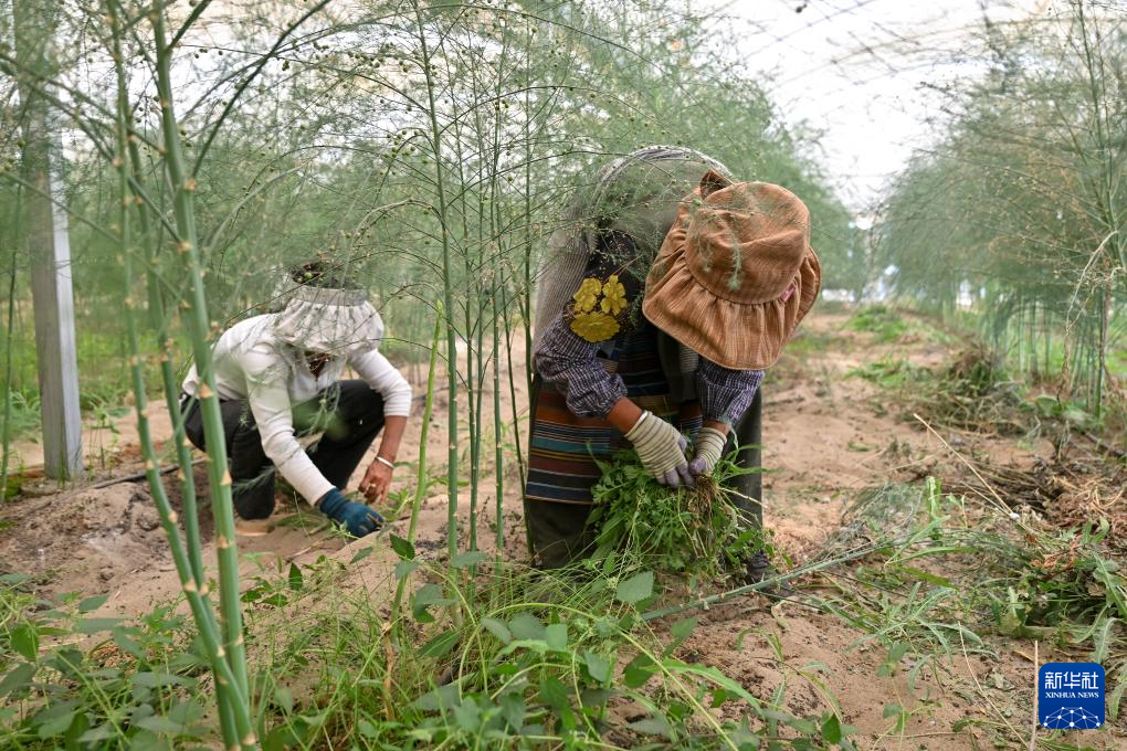 7月19日,西藏扎囊縣綠之源現(xiàn)代農(nóng)業(yè)科技股份有限公司的員工在有機(jī)蘆筍大棚內(nèi)手工除草。新華社記者 李鑫 攝