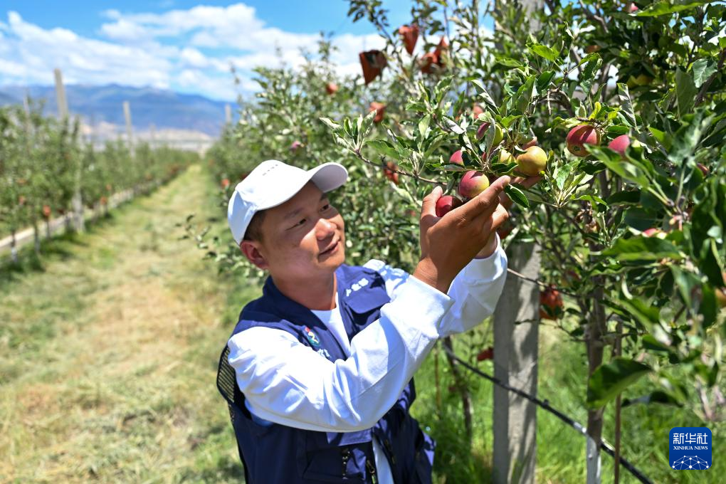 7月19日,西藏扎囊縣的矮化蘋果種植園區(qū)的工作人員查看蘋果長勢。新華社記者 李鑫 攝