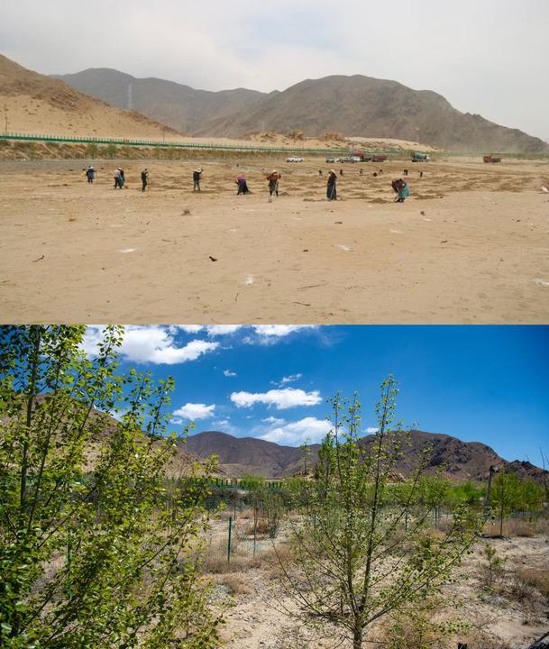 這是一張拼版照片。上圖為西藏山南市貢嘎縣境內(nèi)拍攝的“先造后補(bǔ)工程”(2021年攝);下圖為西藏山南市貢嘎縣境內(nèi)拍攝的拉薩南北山造林綠化(貢嘎段)(2025年4月24日攝)。新華網(wǎng) 旦增努布 攝