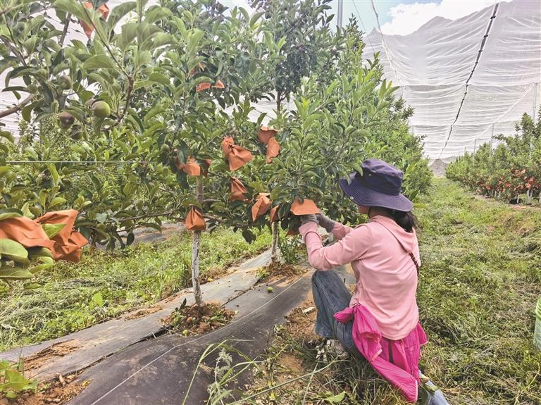 員工正在給蘋果套袋。