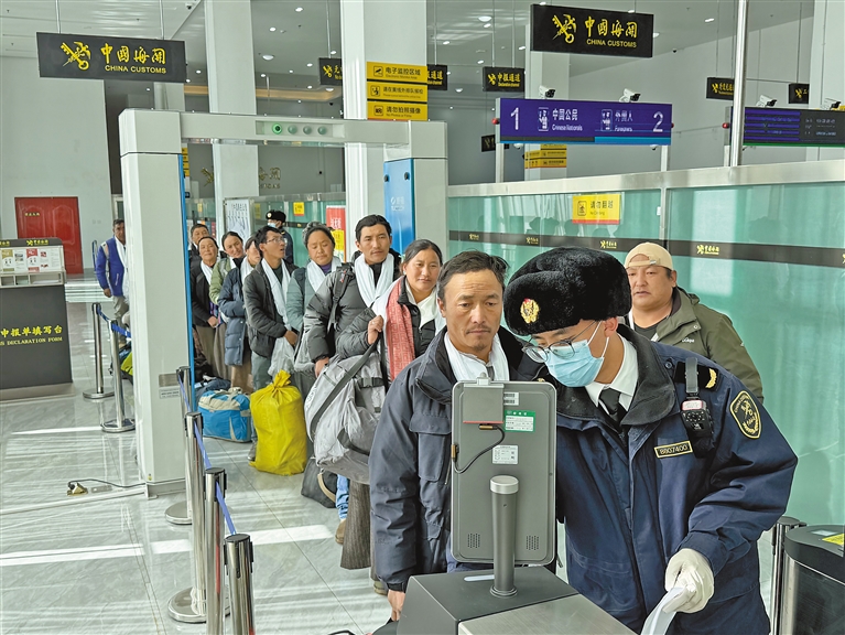 圖為拉薩海關(guān)所屬日喀則海關(guān)關(guān)員在里孜口岸開(kāi)展監(jiān)管查驗(yàn)工作,確保旅客入境順暢。圖/文 記者 李梅英