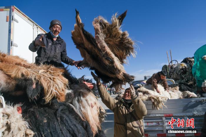 12月15日,西藏自治區(qū)那曲市第十八屆畜產(chǎn)品展銷會上,牧民在整理待售的羊皮。江飛波 攝