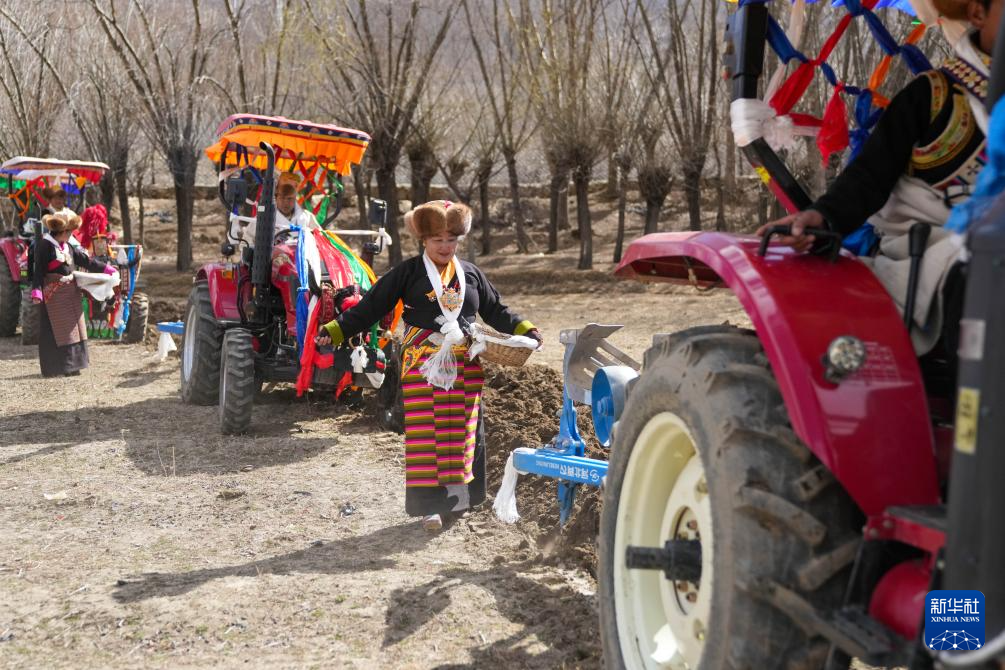 3月16日,山南市結(jié)巴鄉(xiāng)結(jié)巴村村民為拖拉機(jī)手和播撒種子的婦女獻(xiàn)上哈達(dá)。新華社記者晉美多吉 攝