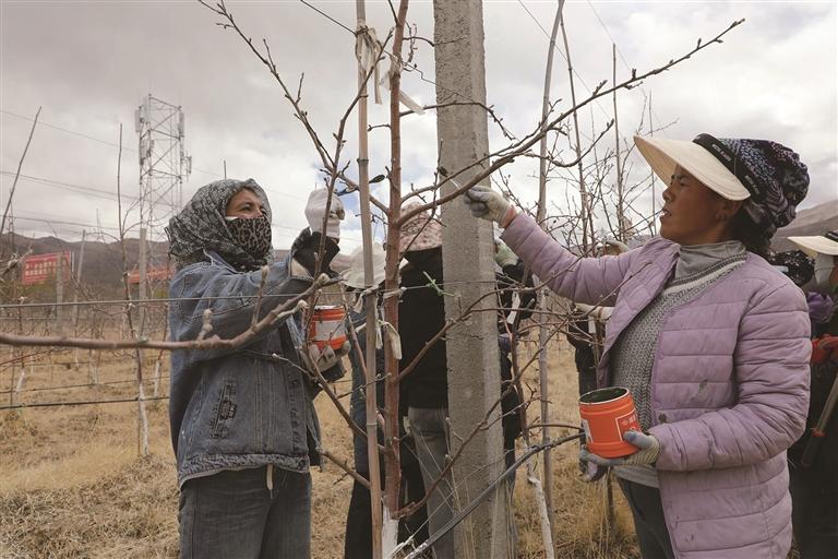 在園區(qū)內,中國農業(yè)科學院果樹研究所專家手把手指導農戶科學管理。修剪現場,專家們精準疏除病蟲枝、弱枝、交叉枝,優(yōu)化果樹樹形結構,保障通風透光;施肥區(qū)域,農戶們嚴格按照科學配比有序施肥,精準補充果樹生長所需養(yǎng)分;針對修剪后的樹枝傷口,工作人員及時涂抹愈合劑,做好防護處理,有效防止病菌侵染、減少養(yǎng)分流失?!耙郧斑@里都是沙子,風很大,現在變化特別大,這邊建成了果園,我們當地老百姓還能在這里務工,每年能拿5萬到6萬元工資。果園內專家們定期給我們培訓,我在這邊也學到了很多蘋果種植技術,我很喜歡這份工作。”扎囊縣扎其鄉(xiāng)朗賽嶺村2組村民洛桑央吉感慨道。