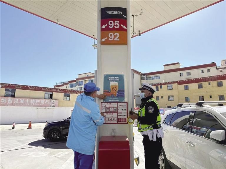 民警在加油站粘貼交通安全宣傳海報(bào)。圖由拉薩交警提供