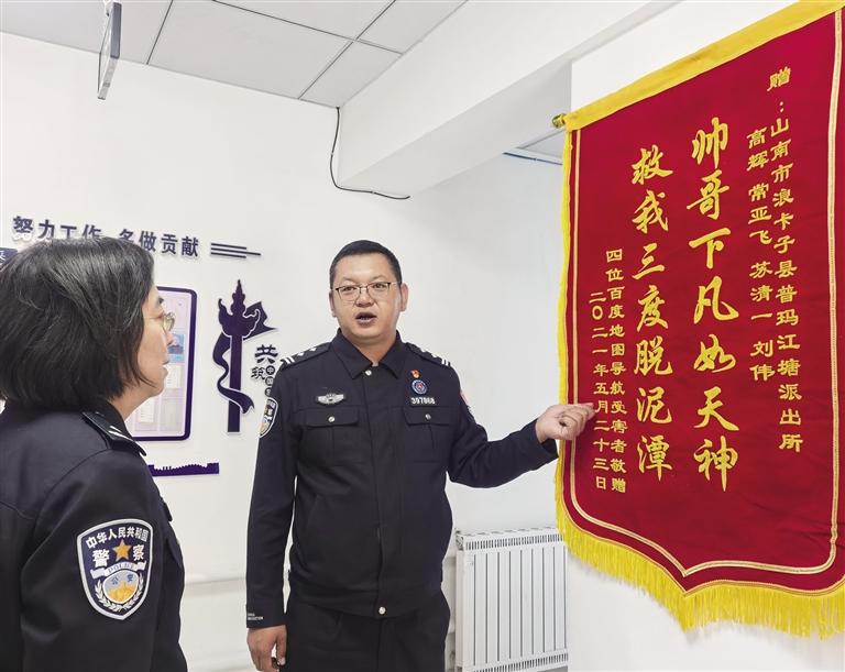 “帥哥下凡如天神,救我三度脫泥潭!”如果錦旗有生命,憑借這兩行字,它無疑會(huì)成為最引人注目的那一個(gè)。這面特別的錦旗存放在山南市邊境管理支隊(duì)普瑪江塘邊境派出所的榮譽(yù)室里。2021年5月,普瑪江塘邊境派出所接到求助電話,稱4名游客駕車前往崗布冰川被困沼澤,亟待救援。接警后,民警迅速到達(dá)現(xiàn)場進(jìn)行救援。游客脫險(xiǎn)后千恩萬謝,與民警互留電話。民警叮囑他們趕緊離開,不要再去冰川了。然而走了還不到5分鐘,民警又接到電話,稱他們再次駕車陷入泥沼動(dòng)彈不得。警車原路返回,進(jìn)行救援。然而民警剛離開10分鐘,再次接到了游客電話:“警官,非常不好意思,我們又陷進(jìn)去了還得麻煩你們再回來一趟?!庇谑?,這面“救我三度脫泥潭”的錦旗便誕生了。