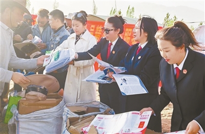 圖為林周縣人民法院工作人員為群眾發(fā)放“生態(tài)法治禮包”。西藏日報(bào)記者 拉巴桑姆攝