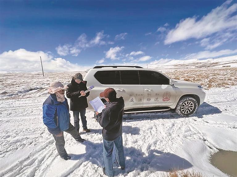 在雙湖縣,人民法院車載科技流動法庭日行千里,加強(qiáng)與生態(tài)管護(hù)站、行政村協(xié)作,構(gòu)建“庭·站聯(lián)合”生態(tài)預(yù)警網(wǎng)格,及時發(fā)布司法保護(hù)令和環(huán)保倡議書。在安多縣,法院干警翻越唐古拉山,深入森布日生態(tài)搬遷安置點(diǎn),通過“加強(qiáng)聯(lián)絡(luò)暢渠道”工作法,與群眾促膝長談,傾聽民意;雁石坪人民法庭干警還主動加入格拉丹東“長江第一滴水”志愿巡護(hù)隊,聘請當(dāng)?shù)攸h員志愿巡護(hù)隊員擔(dān)任生態(tài)法治巡護(hù)聯(lián)絡(luò)員,凝聚保護(hù)青藏高原生態(tài)的法治合力。