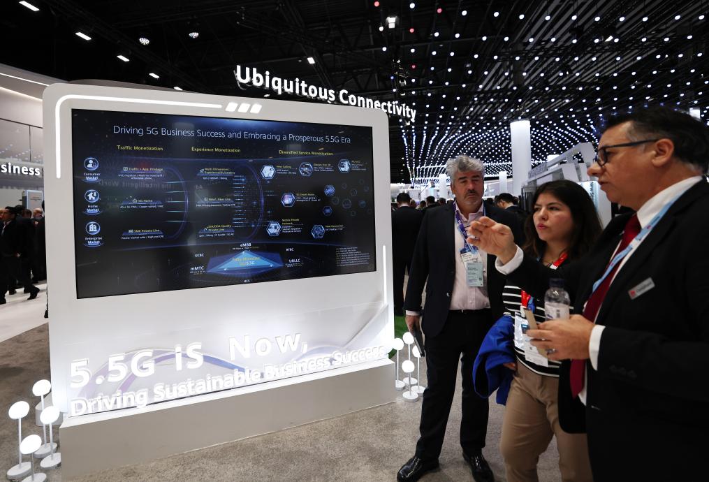2月28日,在西班牙巴塞羅那舉行的2024年世界移動通信大會上,人們在華為展臺關注5G-A技術(shù)。新華社記者高靜 攝