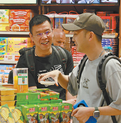 在泰國曼谷素萬那普機(jī)場免稅店,兩名中國游客正在購買當(dāng)?shù)靥厣a(chǎn)品。本報(bào)記者 白元琪攝