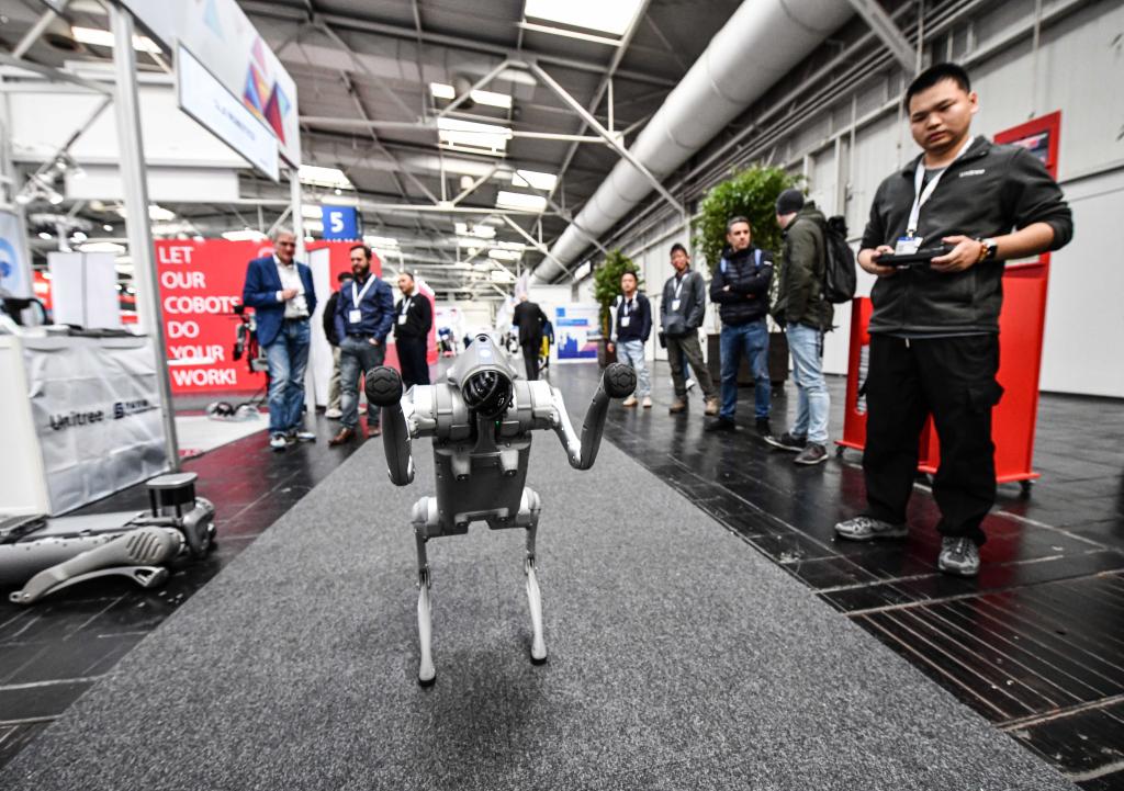 4月22日,在德國(guó)漢諾威工博會(huì)上,杭州宇樹(shù)科技有限公司參展商(右一)在展示一款機(jī)器狗。新華社記者任鵬飛攝