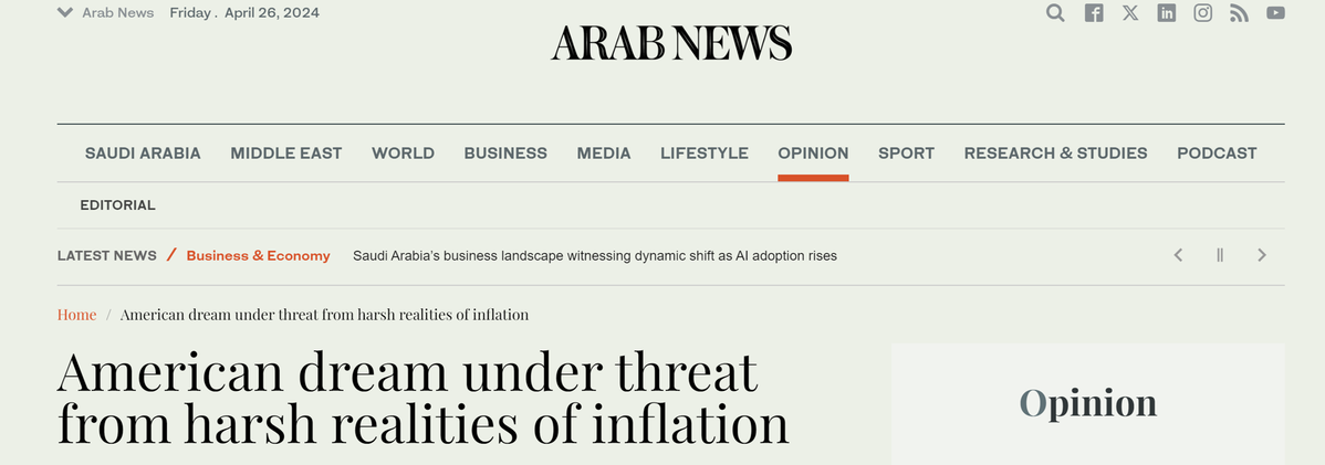 沙特阿拉伯媒體《阿拉伯新聞》網(wǎng)站4月24日刊發(fā)評論文章稱,美國通脹高企,物價不斷上漲,導致民眾的購買力持續(xù)下降,基本生活消費品成為無力負擔的“奢侈品”。“美國夢”被殘酷的現(xiàn)實擊潰。文章批評美國政府對通脹危機的反應嚴重不足,將黨派問題置于解決民眾的迫切需求之上,削弱了民眾的信任感。