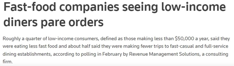 咨詢公司“收入管理解決方案”此前發(fā)布的一項民調(diào)結果顯示,年收入在5萬美元以下的美國人中,約有四分之一的人減少了快餐消費。