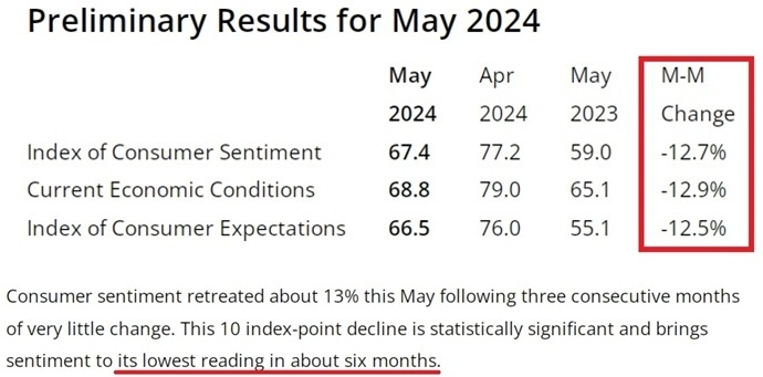 密歇根大學的最新調(diào)查顯示,由于預期通脹率和利率都將維持在高位,美國5月消費者信心指數(shù)(CSI)在連續(xù)三個月幾乎持平后較上月大幅回落了約13%,降至約半年來的最低水平。