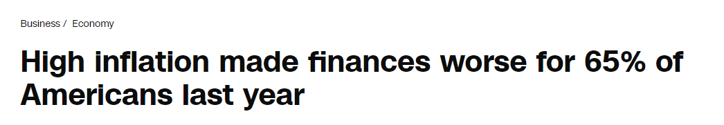 美聯(lián)儲近日發(fā)布的《2023年美國家庭經(jīng)濟狀況報告》(Economic Well-Being of US Households)顯示,65%的美國家庭的財務(wù)狀況因通脹而惡化,其中19%的人認為財務(wù)狀況“嚴重惡化”。