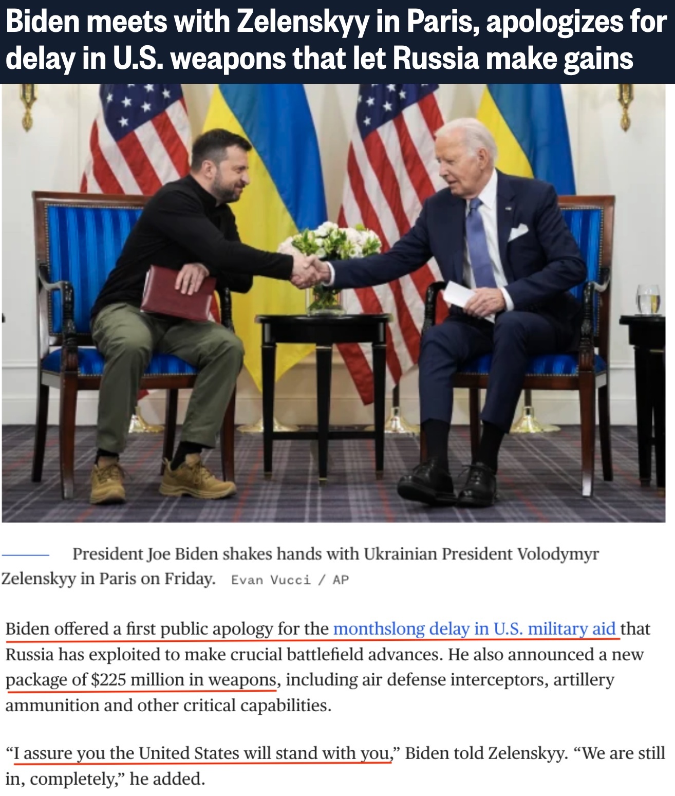 在巴黎會見烏克蘭總統(tǒng)澤連斯基時,拜登首次就美國國會未能更早通過對烏新援助法案“道歉”,并宣布將再向?yàn)蹩颂m提供2.25億美元援助。