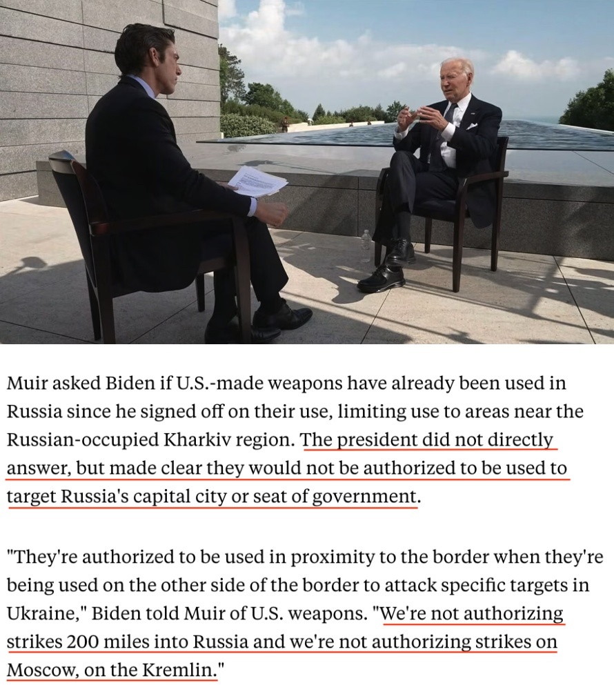 “它們(這些武器)被授權(quán)在(烏俄)邊境附近使用……我們沒有授權(quán)(烏克蘭)向俄羅斯境內(nèi)200英里(約合320公里)的地方發(fā)動襲擊,也沒有授權(quán)對莫斯科、克里姆林宮進(jìn)行打擊?!?/p>