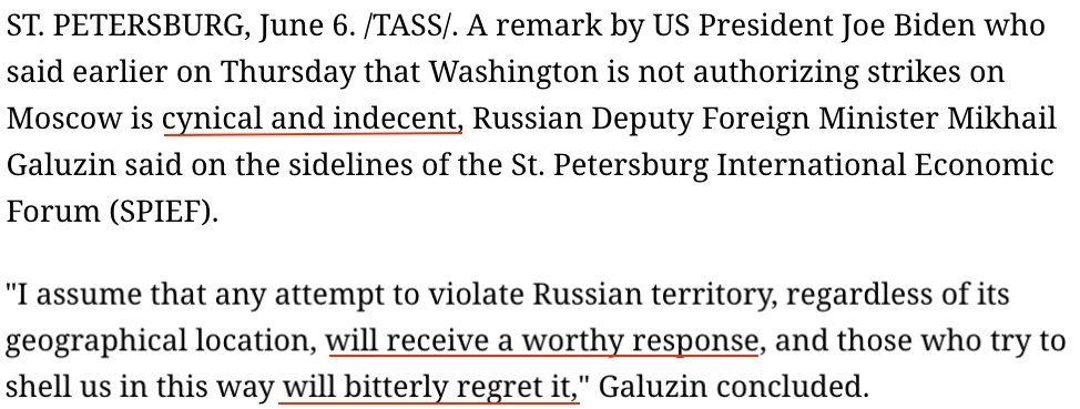 對此,俄羅斯副外長加盧津回應(yīng)稱,拜登關(guān)于可以襲擊俄邊境地區(qū)、但不能襲擊莫斯科和克里姆林宮的表態(tài)是“卑鄙且失禮”的。
