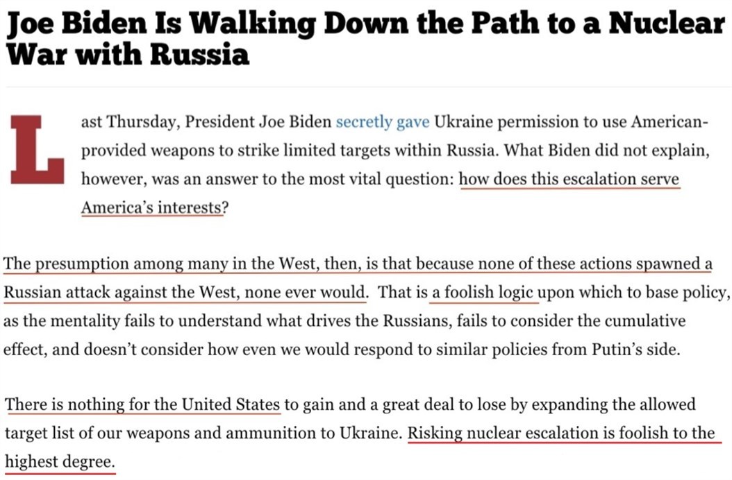 文章認(rèn)為,允許烏克蘭擴(kuò)大美援武器的打擊范圍對美國有百害而無一利。在美國安全并未受到威脅的情況下,冒險與俄羅斯爆發(fā)核戰(zhàn)爭簡直“蠢透了”。
