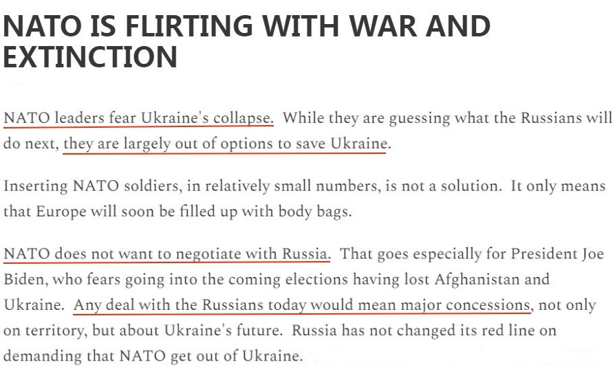 “正如歐美一些嚴(yán)肅的思考者所認(rèn)識到的那樣,北約把一場更大的戰(zhàn)爭視如兒戲是極其危險的行為。”