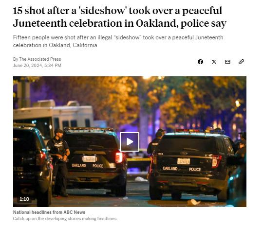 據(jù)報道,奧克蘭警方表示,槍擊事件發(fā)生在該市舉行的一場未經(jīng)批準(zhǔn)的六月節(jié)慶?;顒悠陂g。有人踩上一輛汽車引擎蓋引發(fā)斗毆,進(jìn)而發(fā)生槍擊事件。