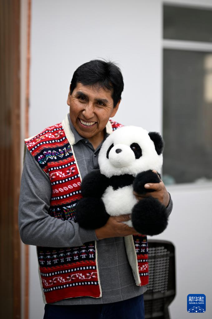 6月20日,在秘魯阿雷基帕,手工藝人奧斯瓦爾多·馬馬尼展示羊駝毛制作的熊貓玩偶。新華社記者 李木子 攝