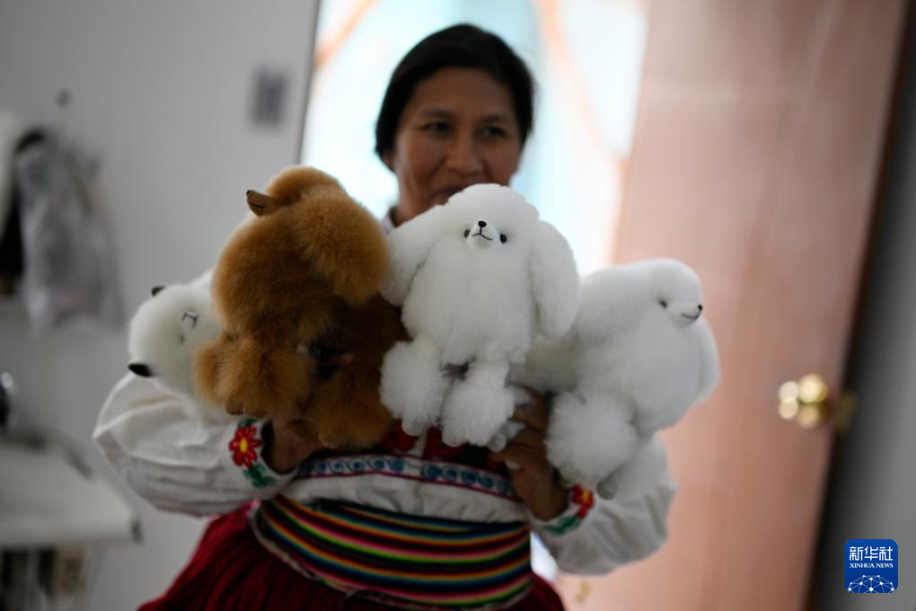 6月20日,在秘魯阿雷基帕,手工藝人奧斯瓦爾多·馬馬尼的妻子展示羊駝毛制作的動(dòng)物玩偶。新華社記者 李木子 攝