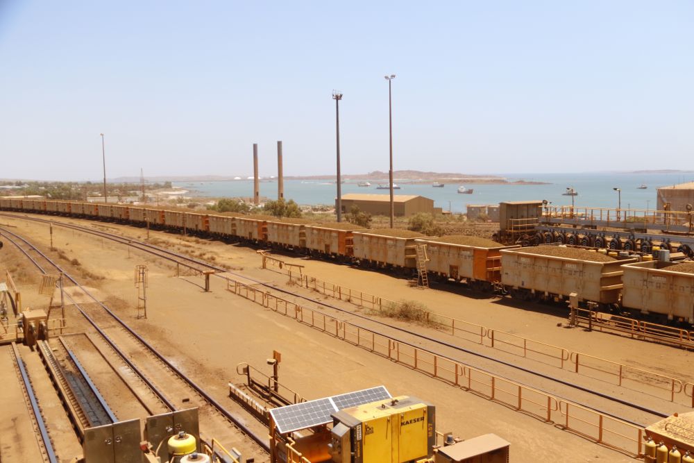 2023年10月20日,在澳大利亞卡拉薩,一列貨運列車正在將鐵礦石運往港口裝船。新華社記者郝亞琳攝