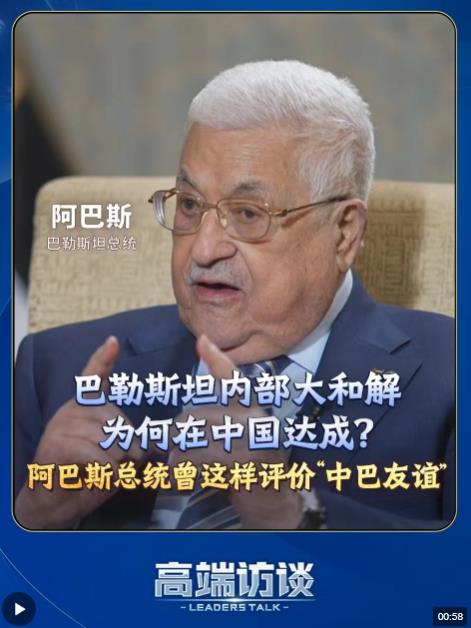 7月23日,巴勒斯坦各派在北京簽署了《關(guān)于結(jié)束分裂加強(qiáng)巴勒斯坦民族團(tuán)結(jié)的北京宣言》。巴勒斯坦內(nèi)部大和解,為何是在中國(guó)?巴勒斯坦總統(tǒng)阿巴斯接受總臺(tái)《高端訪談》專訪時(shí)曾這樣評(píng)價(jià)中巴友誼,來(lái)聽(tīng)聽(tīng)他怎么說(shuō)。