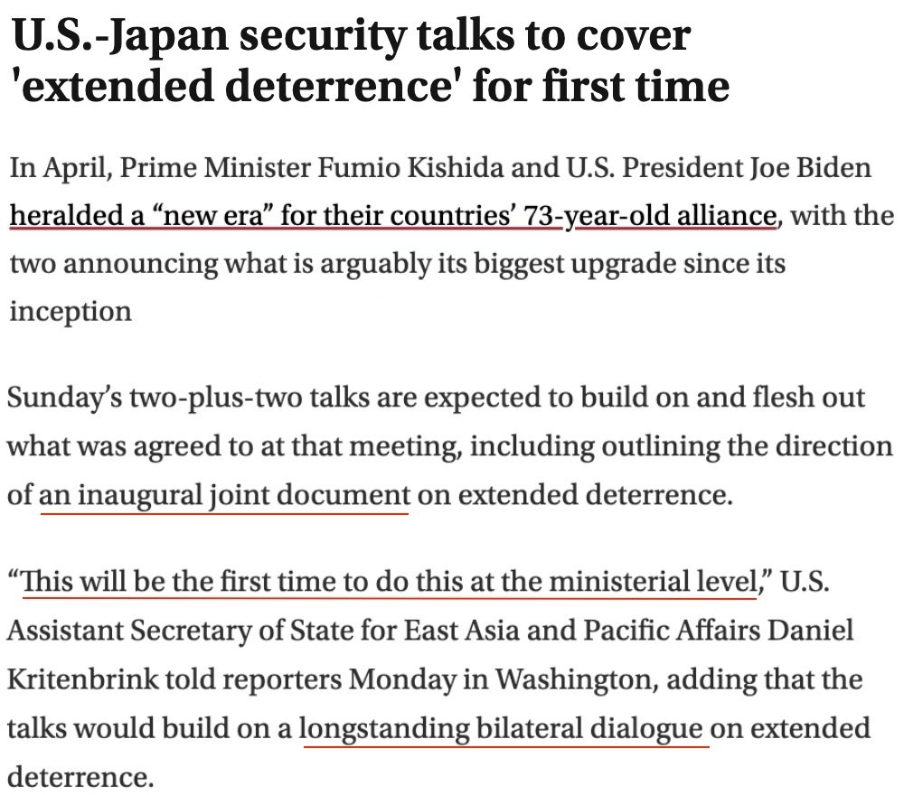 “我們對日本盟友的安全承諾是牢不可破的,我們承諾使用美國可以使用的一切手段,包括核武器,以確保我們履行這些承諾。”
