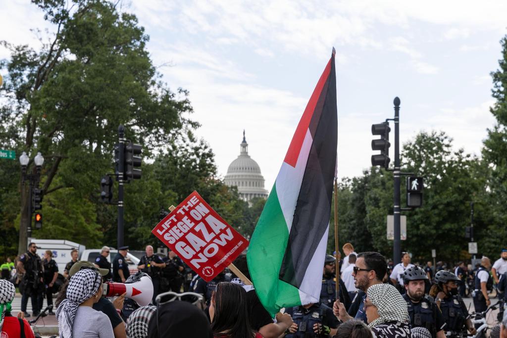 7月24日,抗議者在美國(guó)首都華盛頓國(guó)會(huì)附近的聯(lián)合車站聚集。當(dāng)日,數(shù)以千計(jì)的示威者在國(guó)會(huì)大廈外抗議內(nèi)塔尼亞胡在國(guó)會(huì)發(fā)表演講。新華社記者胡友松攝