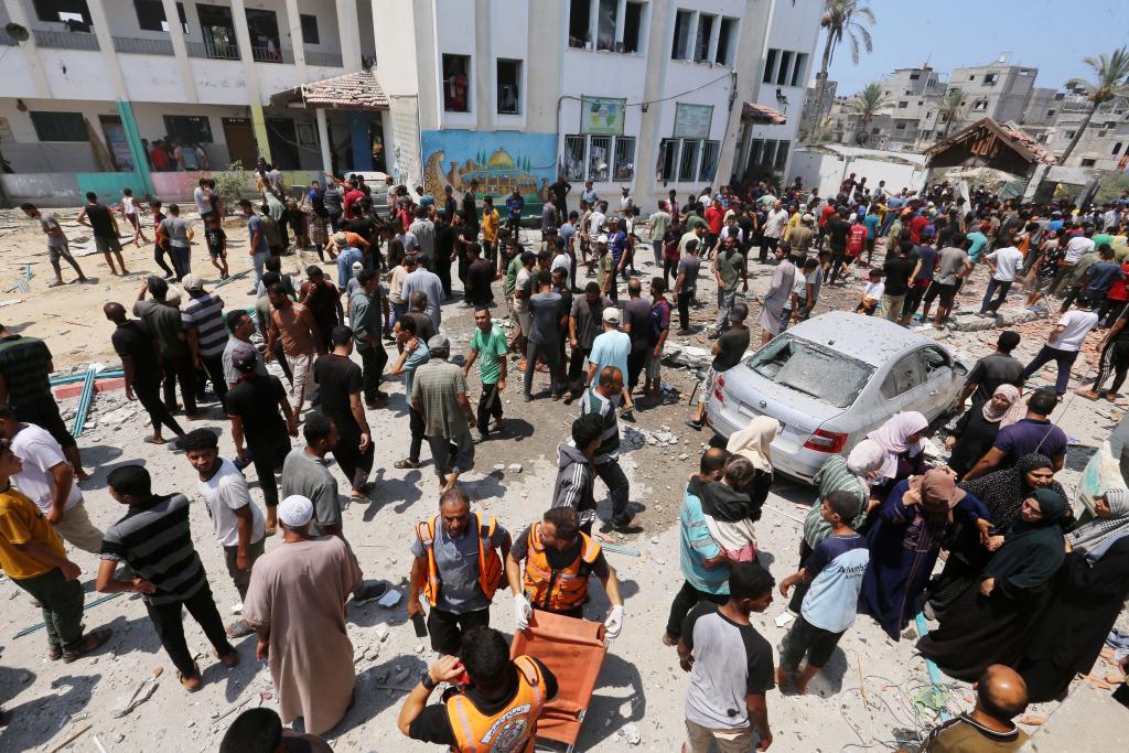 7月27日,巴勒斯坦加沙地帶衛(wèi)生部門發(fā)表聲明說,以色列軍隊(duì)當(dāng)天轟炸加沙地帶中部代爾拜拉赫一家野戰(zhàn)醫(yī)院,造成至少30人死亡、超過100人受傷。圖為人們聚集在以軍襲擊現(xiàn)場(chǎng)附近。新華社發(fā)(里澤克·阿卜杜勒賈瓦德攝)