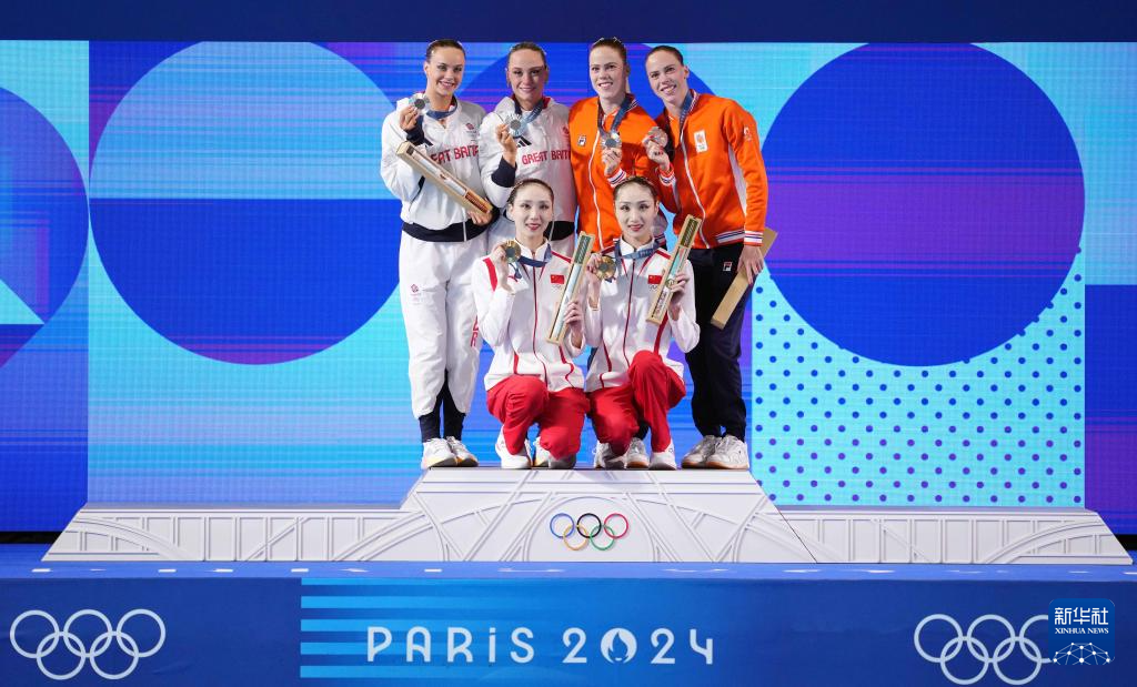 8月10日,冠軍中國組合王柳懿/王芊懿(前)、亞軍英國組合凱特/索普(后左)、季軍荷蘭組合布雷赫耶/諾爾蒂在頒獎儀式上合影。新華社記者 薛宇舸 攝