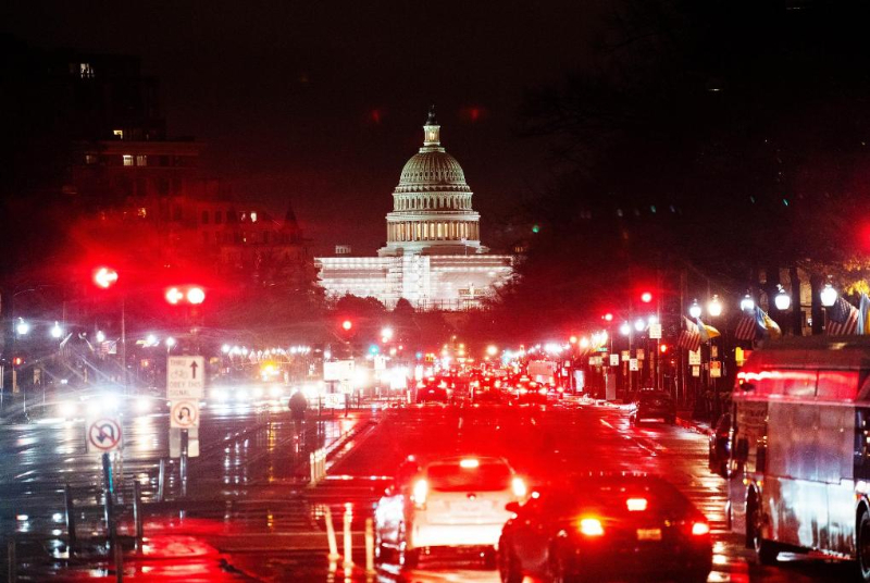 這是2022年12月22日在美國華盛頓拍攝的雨中的車輛和國會(huì)大廈。新華社記者劉杰攝