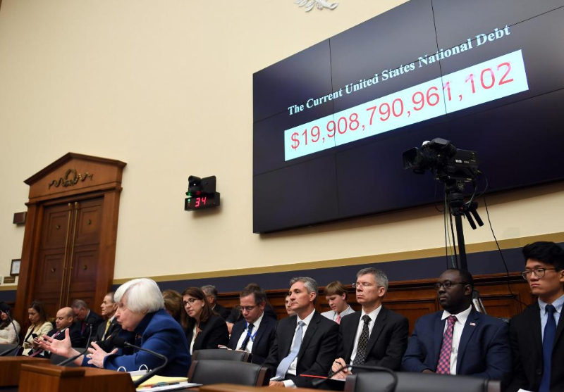 2017年7月12日,時(shí)任美國聯(lián)邦儲(chǔ)備委員會(huì)主席耶倫(前)在華盛頓出席國會(huì)聽證會(huì),屏幕顯示美國當(dāng)時(shí)的國債近20萬億美元。新華社記者殷博古攝
