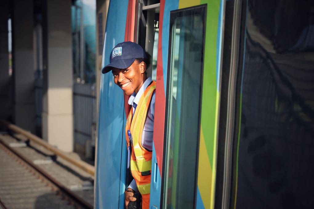 6月12日,在尼日利亞拉各斯,拉各斯輕軌藍(lán)線項(xiàng)目動(dòng)車組列車司機(jī)組長(zhǎng)伊莎貝拉·亞當(dāng)斯·伊斯拉埃爾與列車合影。新華社發(fā),中土集團(tuán)尼日利亞有限公司供圖