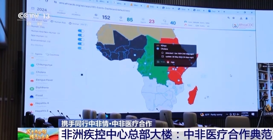 在位于非洲疾控中心八層的應急指揮大廳里,巨大的顯示屏顯示著新型冠狀病毒、猴痘、埃博拉、登革熱等傳染病數(shù)據(jù),配套設置有數(shù)據(jù)采集系統(tǒng),可以讓疾病數(shù)據(jù)第一時間上傳到應急指揮大廳,確保數(shù)據(jù)實時更新,為疾控決策提供依據(jù)。