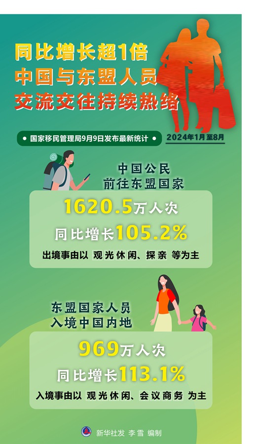 國家移民管理局9日發(fā)布最新統(tǒng)計,2024年1月至8月,中國公民前往東盟國家1620.5萬人次,同比增長105.2%,出境事由以觀光休閑、探親等為主;東盟國家人員入境中國內地969萬人次,同比增長113.1%,入境事由以觀光休閑、會議商務為主。