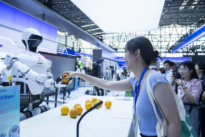 9月20日,在2024世界制造業(yè)大會展館內(nèi),人形機(jī)器人“啟江二號”抓取橙子遞給參觀者。新華社記者 黃博涵 攝