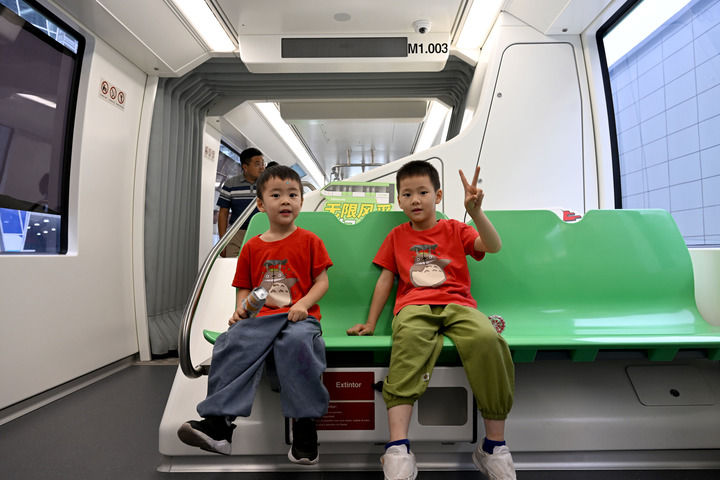 9月21日,在2024世界制造業(yè)大會上,小朋友參觀體驗阿爾斯通跨座式單軌列車。新華社記者 黃博涵 攝