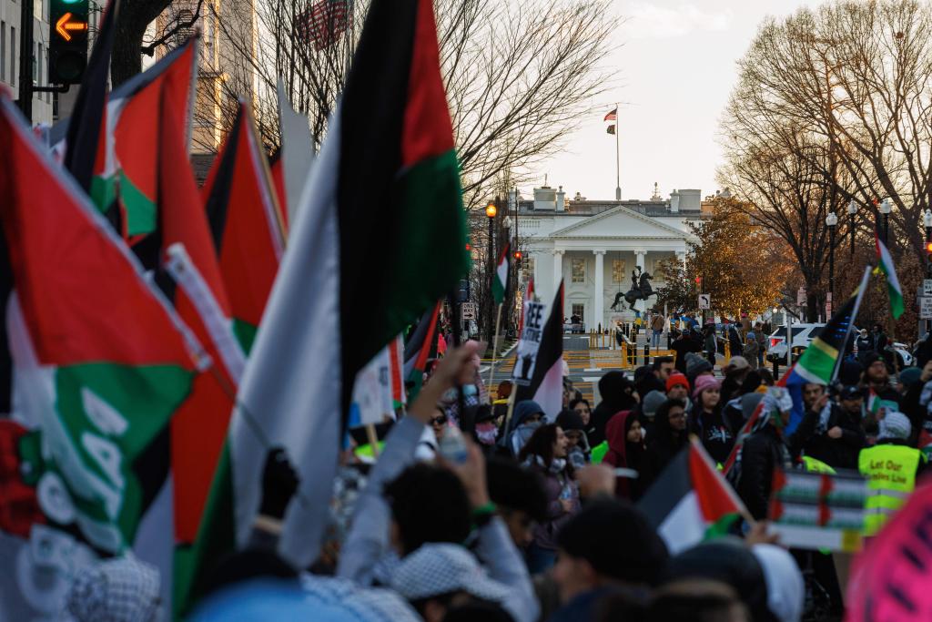1月13日,在美國(guó)首都華盛頓,人們參加聲援巴勒斯坦的集會(huì)游行活動(dòng)。大批示威者揮舞旗幟和標(biāo)語(yǔ),高喊口號(hào)聲援巴勒斯坦,呼吁?;?。新華社發(fā)(亞倫攝)