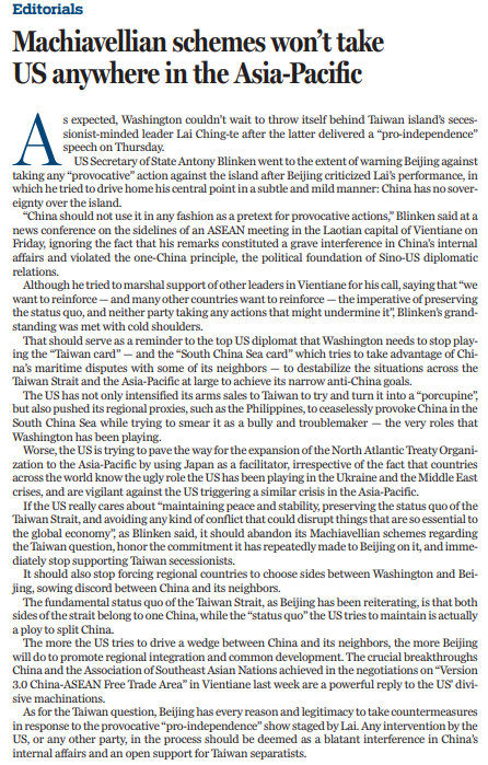 美國(guó)國(guó)務(wù)卿布林肯11日在萬(wàn)象舉行記者會(huì)表示,中國(guó)不應(yīng)以賴清德“雙十”講話為借口采取“挑釁行動(dòng)”。布林肯大放厥詞,嚴(yán)重干涉中國(guó)內(nèi)政,違反一個(gè)中國(guó)原則,而該原則正是中美關(guān)系的政治基礎(chǔ)。