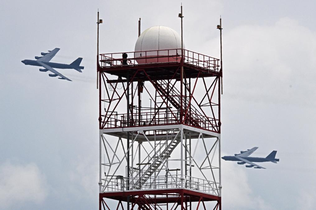 2024年2月22日,兩架美國空軍B-52轟炸機在新加坡航展上做飛行表演。新華社發(fā)(鄧智煒攝)