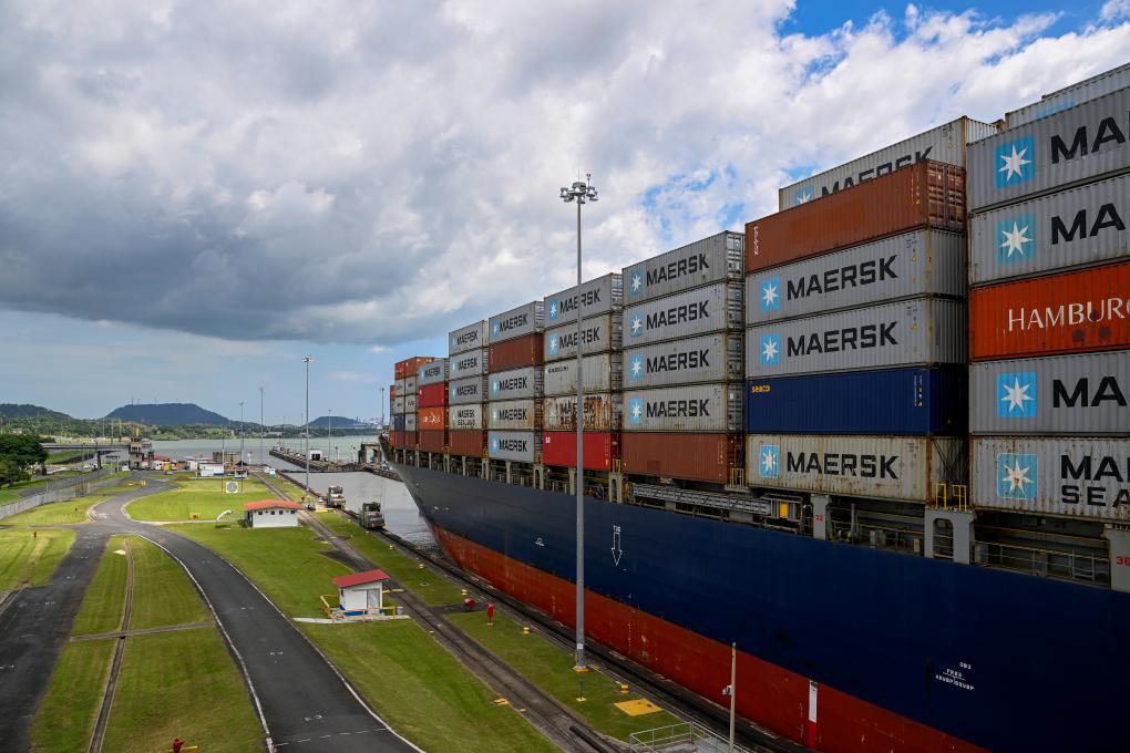 8月28日,在巴拿馬首都巴拿馬城附近,一艘貨輪通過巴拿馬運(yùn)河的米拉弗洛雷斯船閘準(zhǔn)備駛?cè)胩窖蟆P氯A社記者李木子攝