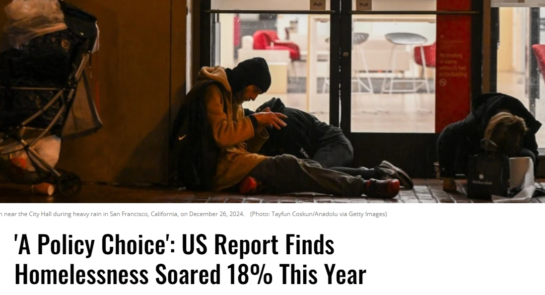 美國住房和城市發(fā)展部(HUD)本月27日發(fā)布報告稱,美國聯(lián)邦無家可歸者追蹤系統(tǒng)記錄到的無家可歸者數(shù)量已超過77萬,與去年同期相比驟增了18.1%,也是自2007年開始此項統(tǒng)計以來的最大增幅。對此,美國《共同夢想》網(wǎng)站(Common Dreams)報道指出,這完全是“政策選擇”,后果可以預見。