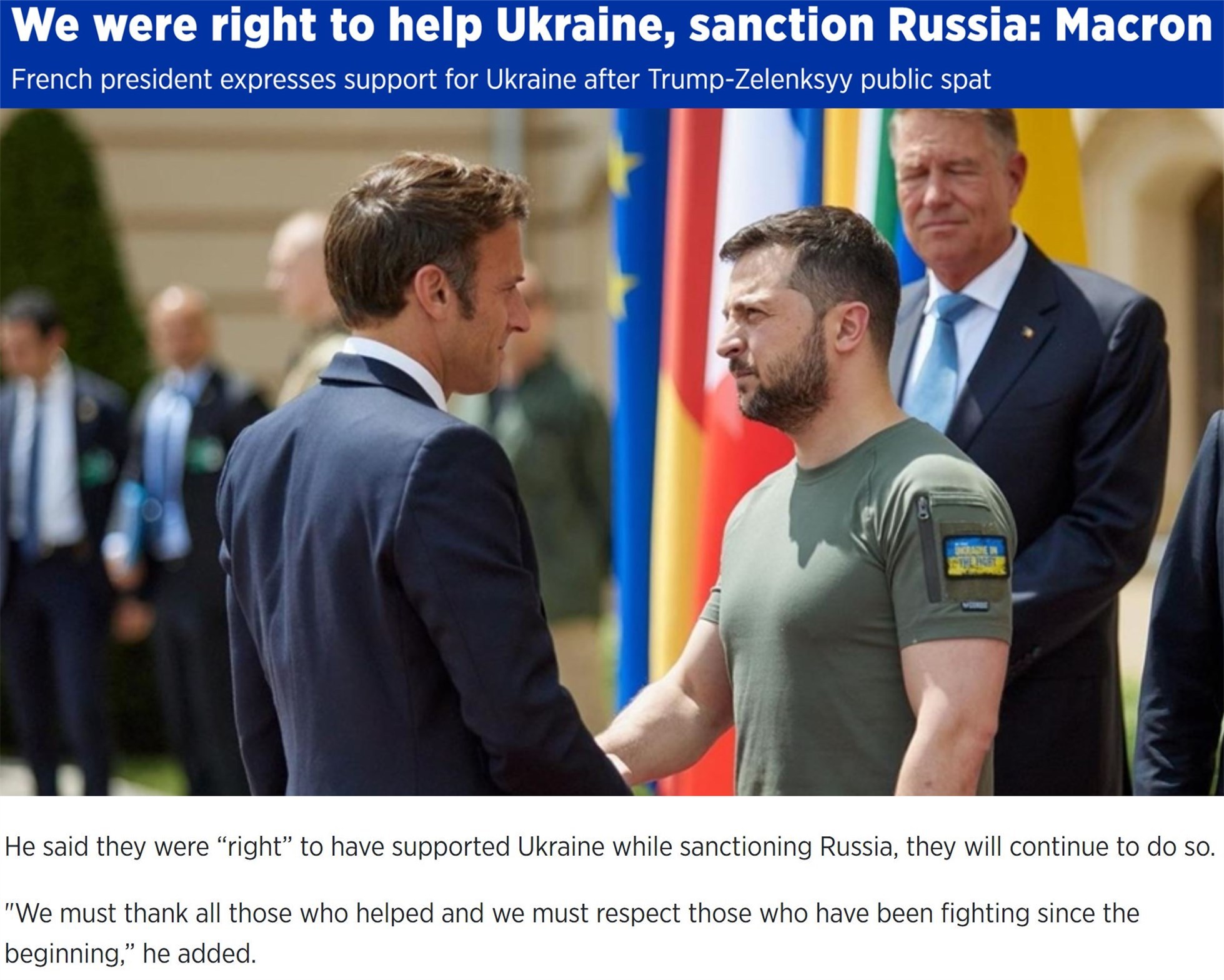 法國(guó)總統(tǒng)馬克龍?jiān)谂c澤連斯基通話后對(duì)媒體稱(chēng),西方支持烏克蘭是“正確”的,而且應(yīng)該繼續(xù)這樣做,因?yàn)椤澳切囊婚_(kāi)始就在戰(zhàn)斗的人是在為歐洲的安全而戰(zhàn)”。