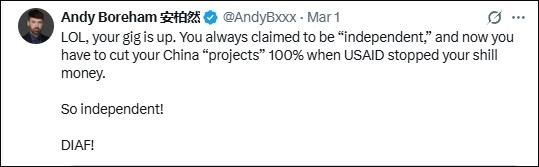 “笑死,你們?nèi)嗽O(shè)崩了?!痹谥袊詈凸ぷ鞫嗄甑男挛魈m媒體人安迪·博勒姆(中文名安柏然)也嘲諷道,“成天標(biāo)榜自己‘獨(dú)立’,現(xiàn)在美國國際開發(fā)署斷了黑錢,對(duì)華‘項(xiàng)目’得100%砍光。還真是獨(dú)立?。≮s緊涼透吧!”