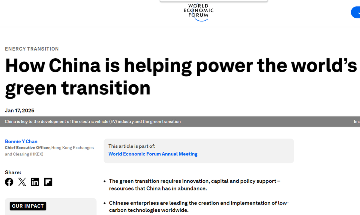 世界經(jīng)濟(jì)論壇網(wǎng)站題為《中國助力全球綠色轉(zhuǎn)型》的文章強(qiáng)調(diào),中國在推動(dòng)全球綠色轉(zhuǎn)型過程中具有關(guān)鍵作用,特別是在電動(dòng)車、可再生能源及低碳技術(shù)領(lǐng)域。